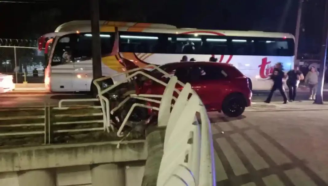 De acuerdo a la información proporcionada, fue un motociclista quien presuntamente propicio que dos vehículos se impactaran, uno de ellos estuvo a punto de caer del puente vehicular al puente de desnivel, quedando atorado sobre un barandal de protección a los peatones.