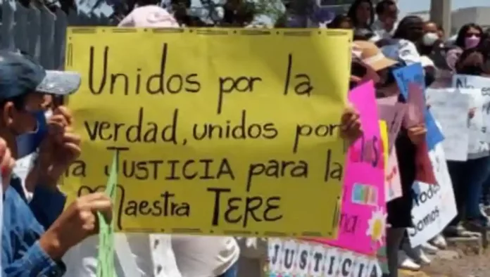 Con pancartas en mano, piden que se haga justicia para la maestra, quien se encuentra en audiencia debido a las ocho carpetas de investigación que se realizaron en su contra por el supuesto maltrato que genero a niños de su clase.