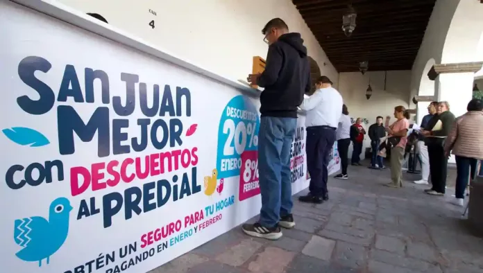 Conforme a la Ley de Ingresos del Municipio de San Juan del Río, al pagar el impuesto predial en enero, las y los contribuyentes serán acreedores a un descuento de 20 por ciento; en tanto, quienes lo hagan en febrero, obtendrán una reducción de 8 por ciento. La ciudadanía que realice su pago puntual en enero y febrero será acreedora a un seguro para vivienda. Estos beneficios tienen la finalidad de contribuir a la construcción de una Mejor Ciudad y una Mejor Sociedad que conlleven a un Legado de Bien Común.