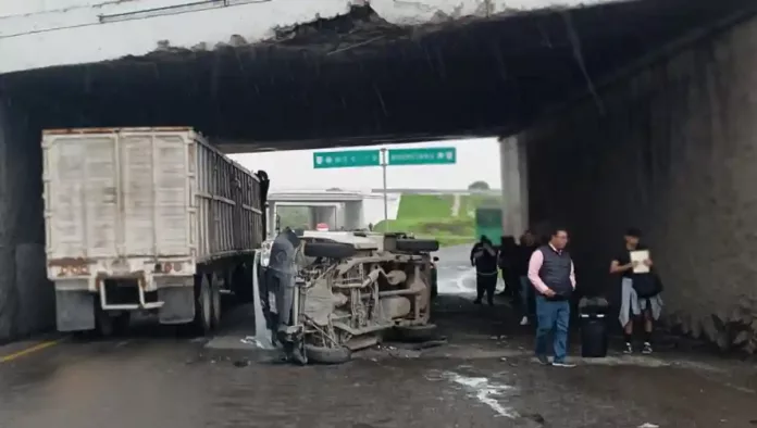 Una volcadura de una camioneta de tres y media toneladas y un vehículo impactado sobre la base del puente vehicular, fue el saldo de un choque, el hecho se registró en la zona conocida como el trébol a la salida a la carretera federal 57.