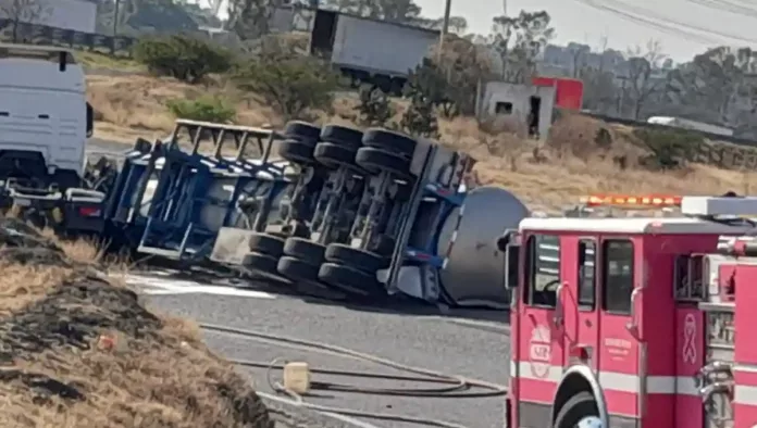 Está mañana se registró la volcadura de una pipa cargada con productos químicos, lo que generó una fuerte movilización por parte de los servicios de emergencia, el hecho se registró en la carretera federal 57 y la intercesión con la 45 Palmillas-Huichapan, Hidalgo.
