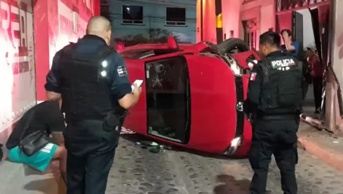 El conductor de un vehículo vento color vino, al parecer perdió el control de su unidad cuando circulaba por la calle, lo que ocasionó que golpeara el zaguán de una vivienda y este a su vez hizo que volcara.