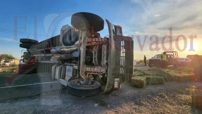 Aparatosa volcadura se registró en la carretera La Llave – La Estancia a la altura del kilómetro siete, dónde un camión del Ejército Mexicano cargado de pacas, perdió el control quedando acostado sobre la carpeta asfáltica.