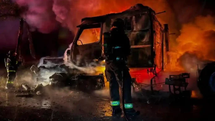 Tras la fuerte lluvia registrada en municipios de la zona metropolitana del estado de Querétaro, esta noche en El Marqués, se registró el incendio de un tractocamión tras ser impactado por un rayo.
