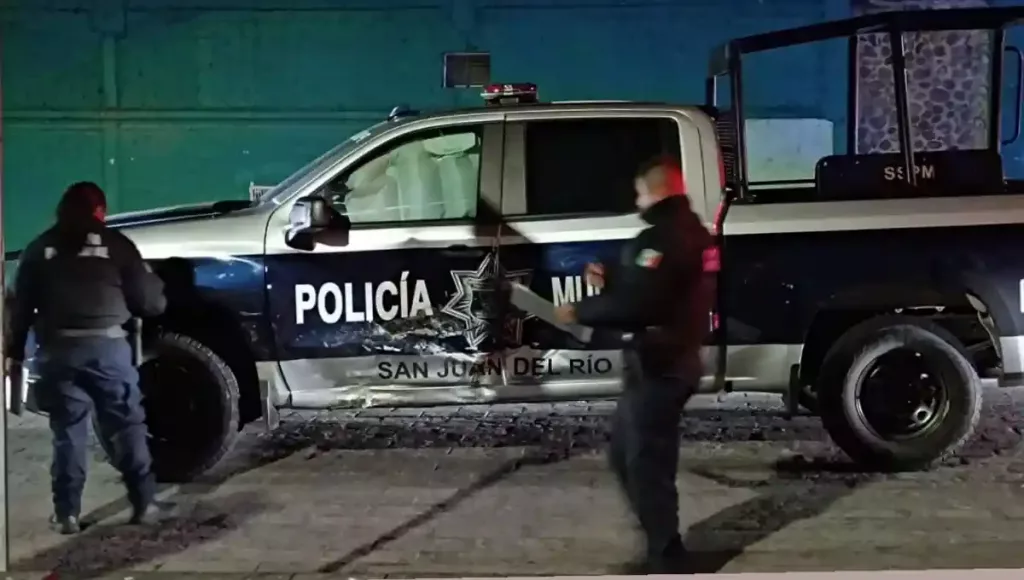Fuerte choque se registró entre una patrulla de la secretaría de Seguridad Pública Municipal y un vehículo particular, esto en calle Mina esquina con Morelos, en el municipio de San Juan del Río.