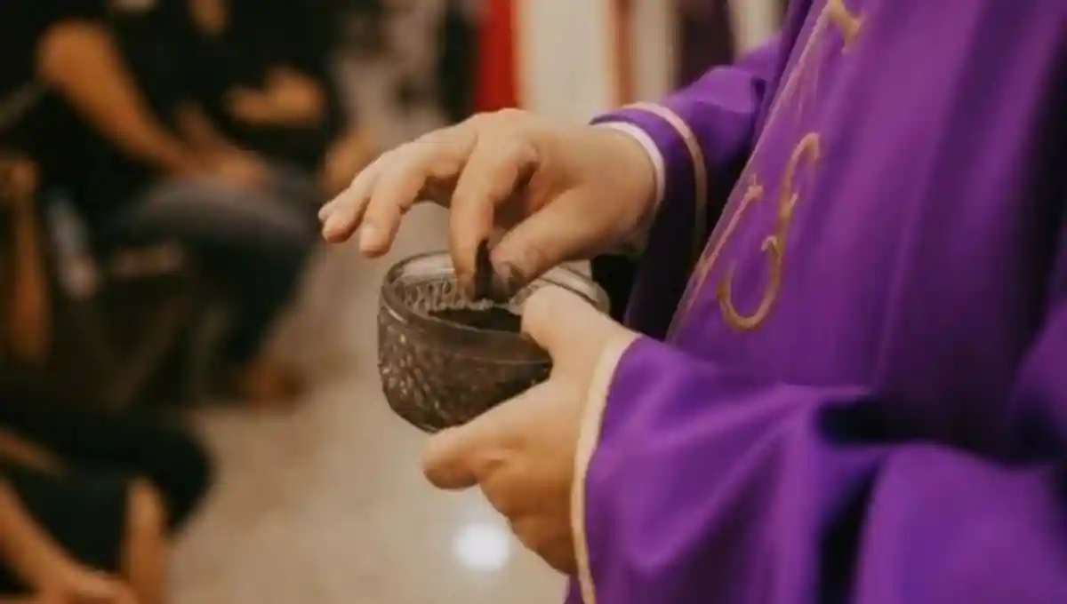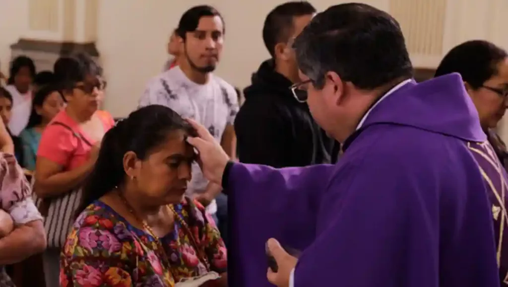 Imposición de la Ceniza: Los fieles acuden a la iglesia para que un sacerdote les marque la frente con una cruz de ceniza mientras se pronuncia una frase como “Arrepentíos y creed en el Evangelio” o “Recuerda que eres polvo y al polvo has de volver”.