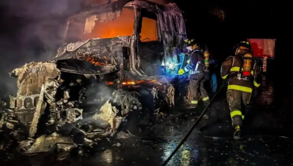 Tras la fuerte lluvia registrada en municipios de la zona metropolitana del estado de Querétaro, esta noche en El Marqués, se registró el incendio de un tractocamión tras ser impactado por un rayo.