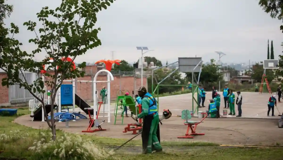El presidente municipal de San Juan del Río, Roberto Cabrera Valencia, en compañía del secretario de Servicios Públicos Municipales, Ernesto Mora Rico, supervisaron los trabajos de mantenimiento, limpieza y mejoramiento de imagen urbana en el parque de la colonia Vista Hermosa.